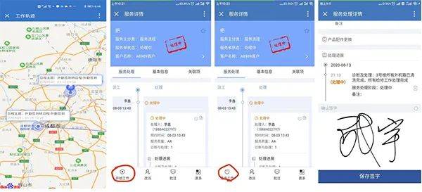 服务部外勤人员上门工作,可通过日程关联到相关客户及服务类型,并上传现场工作水印图片,从开始时间到结束时间,形成工作轨迹,系统自动生成并沉淀数据,有追溯有存档。