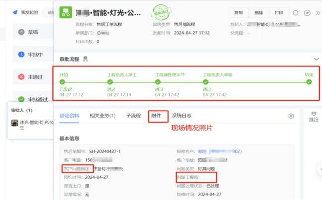 服务:通过售后模块工作流,由销售发起、工程部主管指定工程师上门,处理结果状态进行反馈记录,再知晓到销售。实现“主动服务 + 高效响应 + 成本可控” 的闭环管理,有效支撑智能设备的市场竞争力