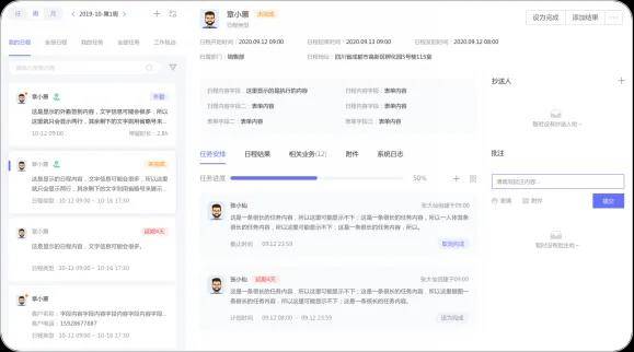 日程及任务:创建日常相关待办事项,以便及时提醒相关参与人员,以防遗漏相应工作事项;根据不同工作类型,下达协同任务,启用表单来规范化员工填写记录,简化任务流程;管理人员实时掌握整个团队的日程及任务安排,了解人员工作饱和度;
