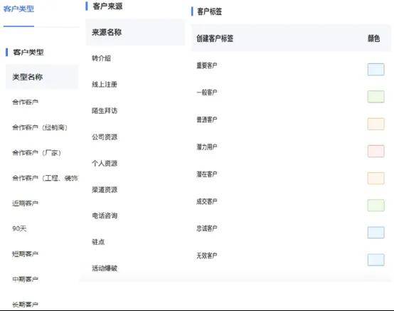 客户分类:对客户价值精准分层,战略客户、潜力客户、普通客户、对手、合作伙伴,标签体系分类客户,同时还可按照公司要求自定义客户基本信息和业务信息关键点