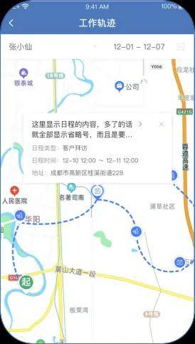 外勤签到+打卡:外勤位置偏差控制,外勤拍照图片上传控制,严控销售人员异常签到,杜绝虚假拜访,全程记录销售人员行动轨迹和停留时长,回溯人员工作记录