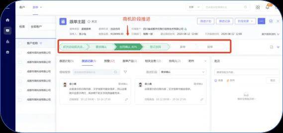跟单阶段:设置跟单阶段(客户建档→需求分析→报价审批→合同签订→交付→回款),制定节点标准,透明追踪跟进过程,管理销售过程,客户跟进时间、进展情况一目了然