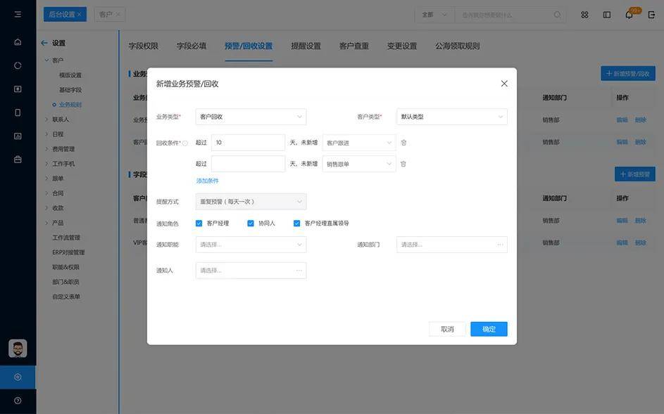 销售领取线索之后需要设定一个跟进期限,超期未跟进的线索会自动回退到【公海池】,通过这一规则督促销售及时跟进,保证客户跟进状态的活性,形成一个良好的跟进规则。