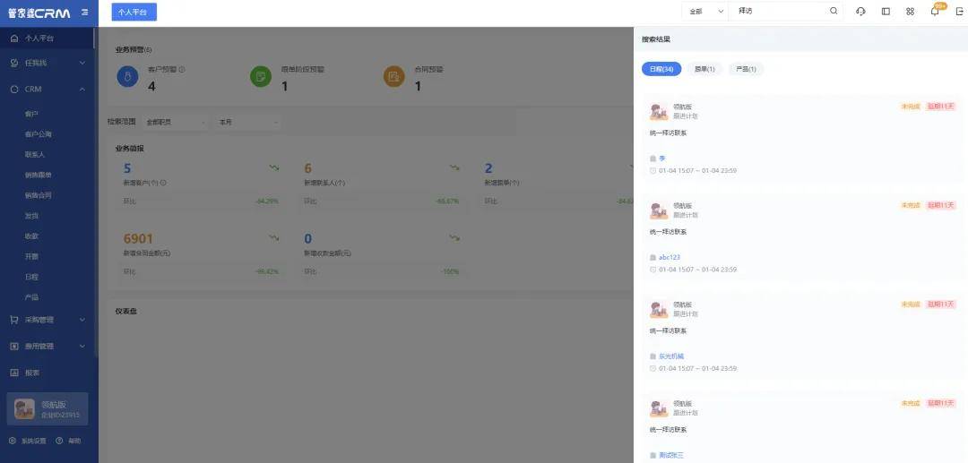 业务场景当用户想要在系统中搜索某条客户信息、订单信息、某个联系人时,却想不起要搜的全名,管家婆CRM的全局搜索能力,可以通过模糊搜索、精准搜索等能力,智能排序给出用户想搜的答案,帮助销售高效记录重要客户信息、跟进关键业务流程,帮助组织洞察业绩目标达成情况,为用户带来更美观、更强大、更高效、更简便的操作体验。