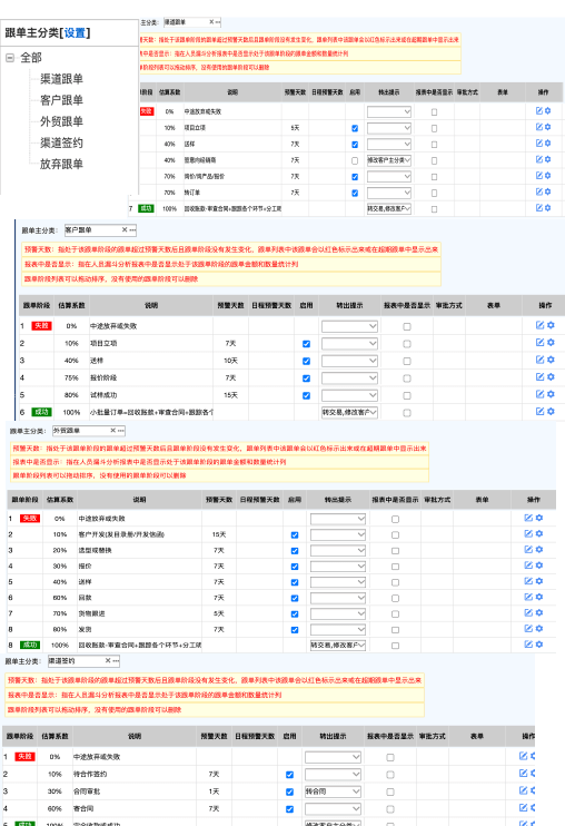 建立详细的客户分类,直营、渠道、代理商等不同分类客户的基本信息和业务信息关键点,管理者不见面就知客户情况;企业还可以根据不同的客户类型设置不同的跟单阶段,保证整个流程按阶段一步步推进,业务员知道如何标准化的跟进客户,管理者也能对推进过程中的风险把控。